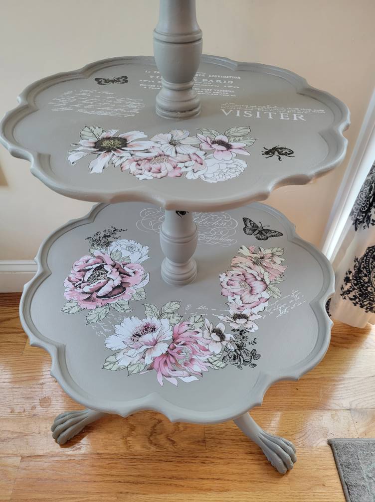 Ths adorable vintage pie table has been updated with flowers and butterflies.