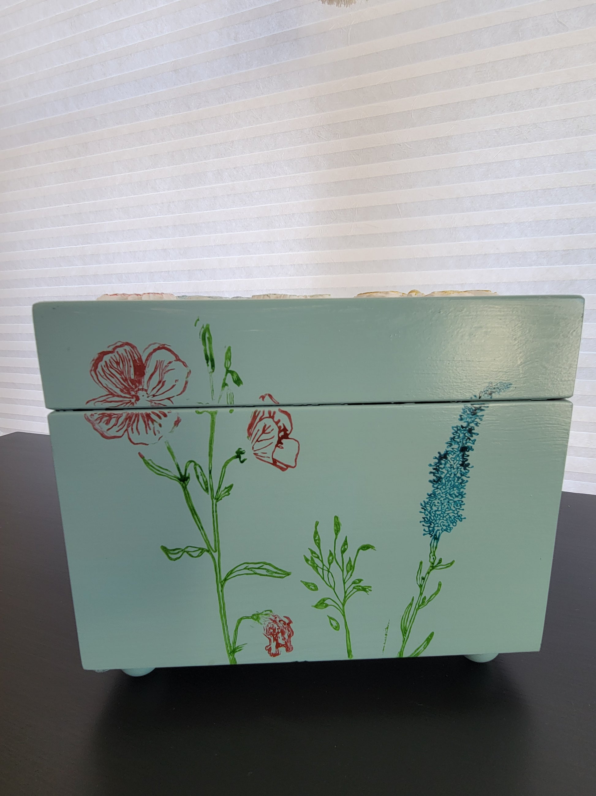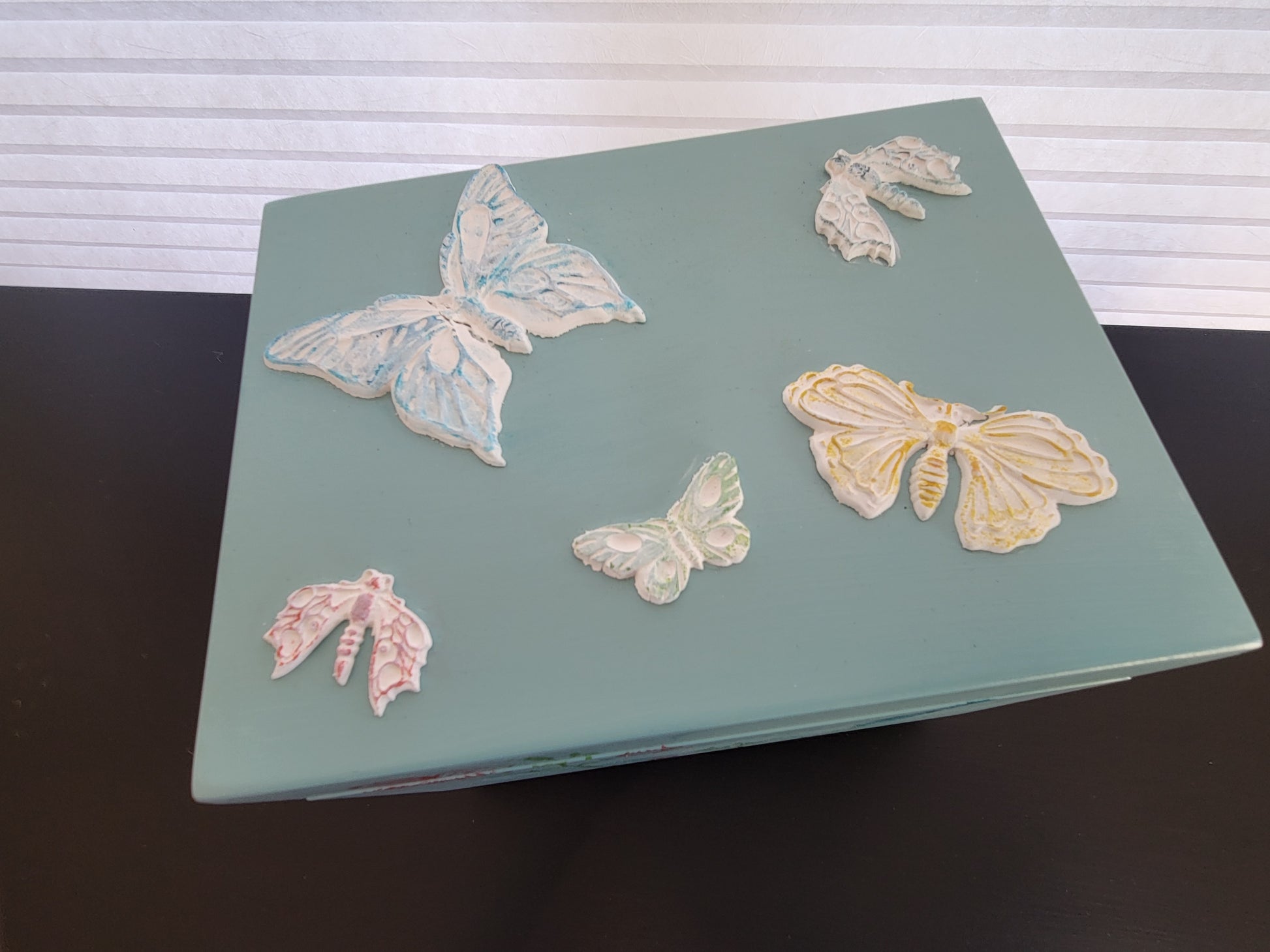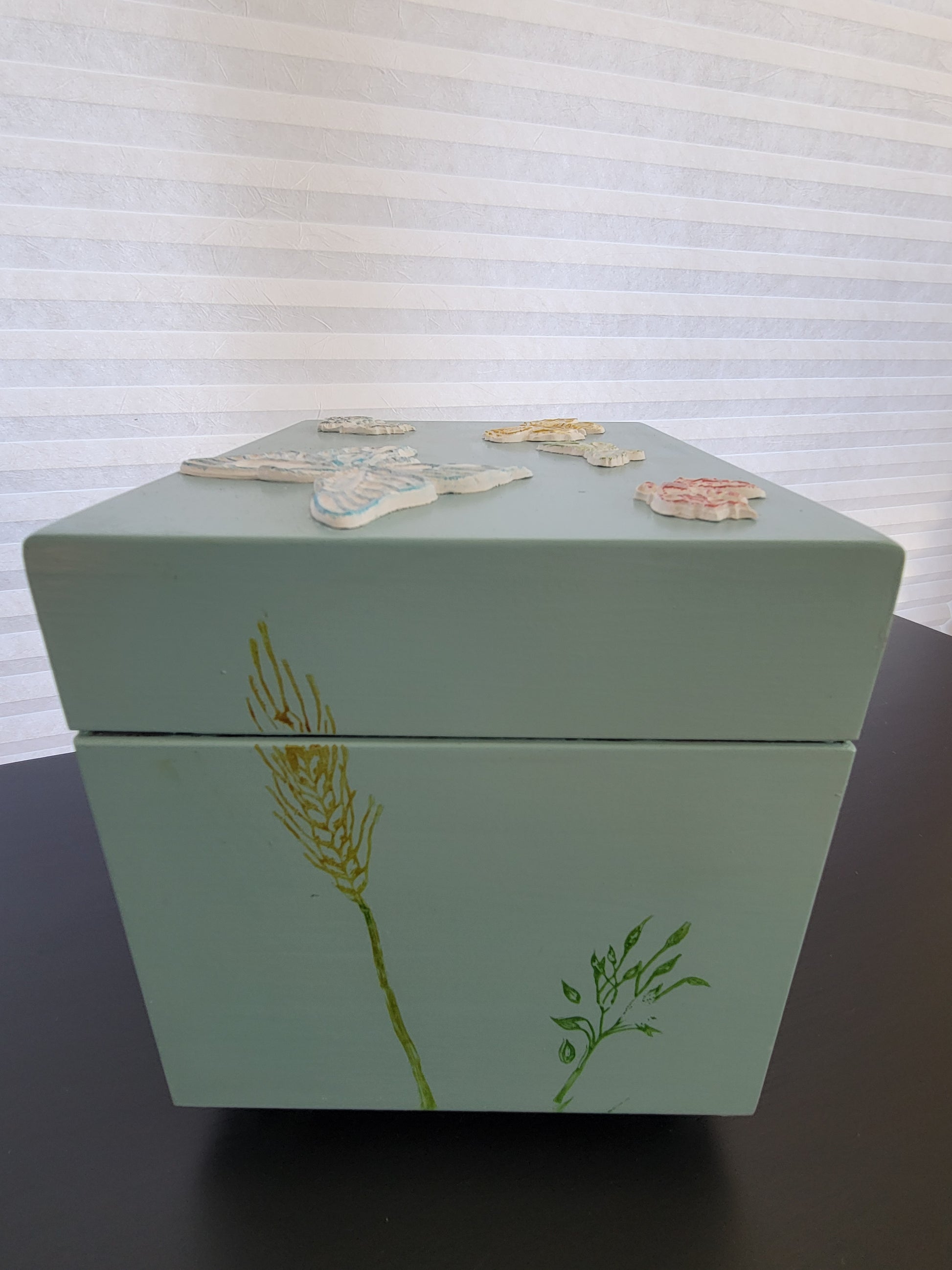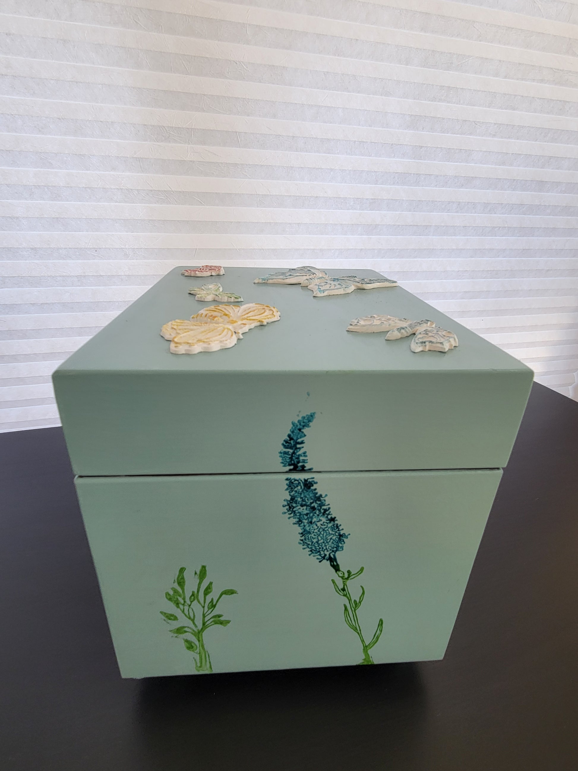 This keepsake box has been handcrafted with a sweet butterfly theme. Great for keepsakes of all kinds.