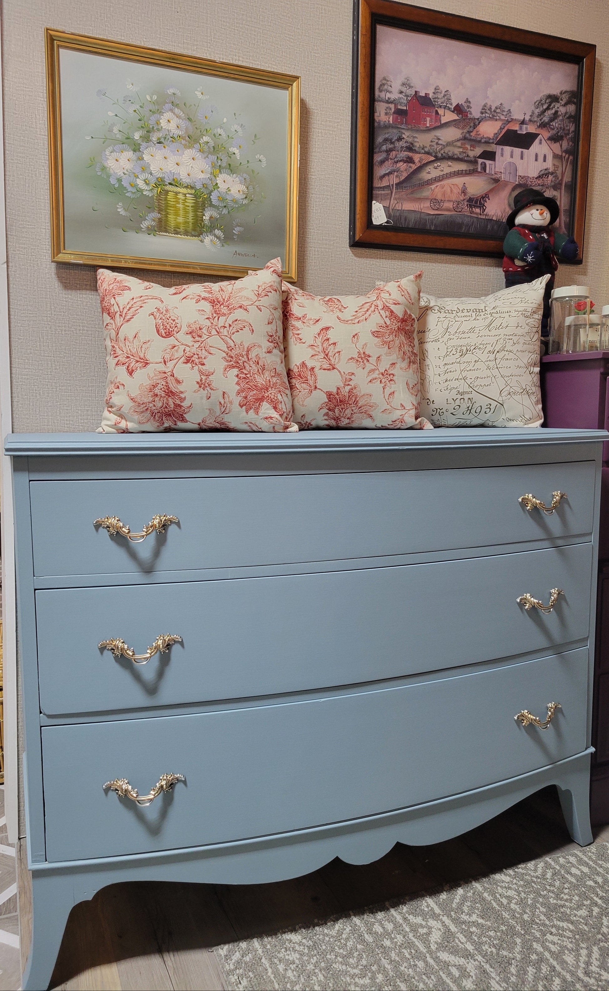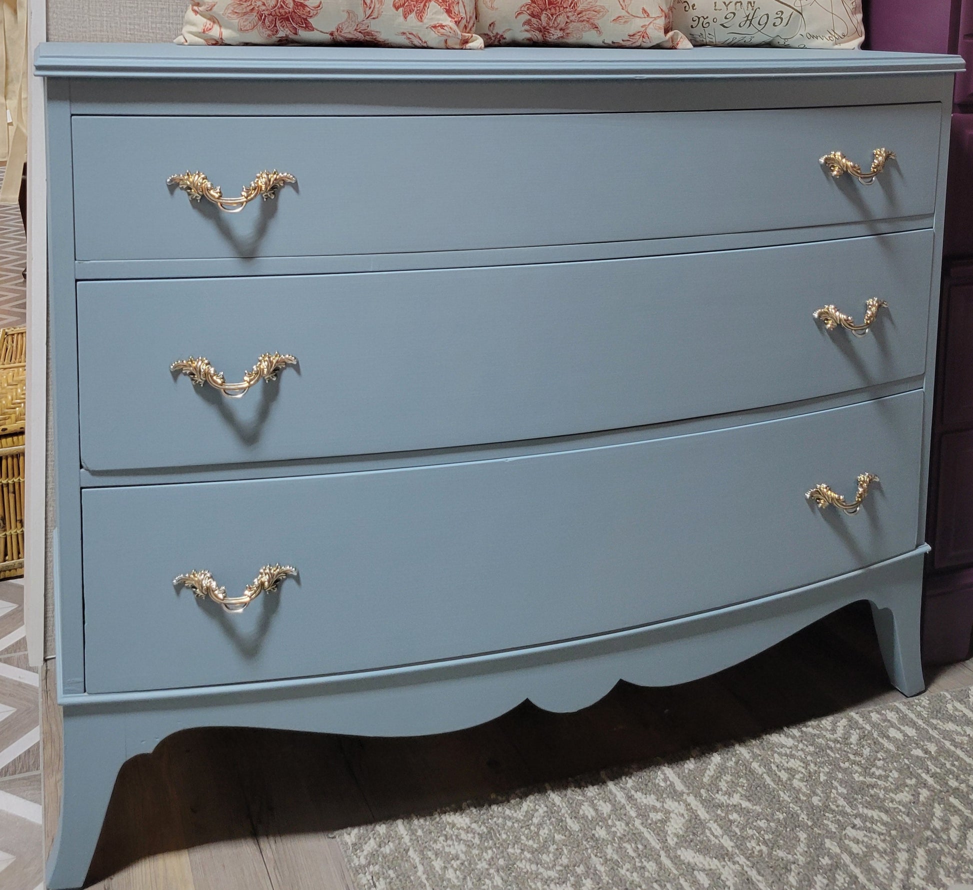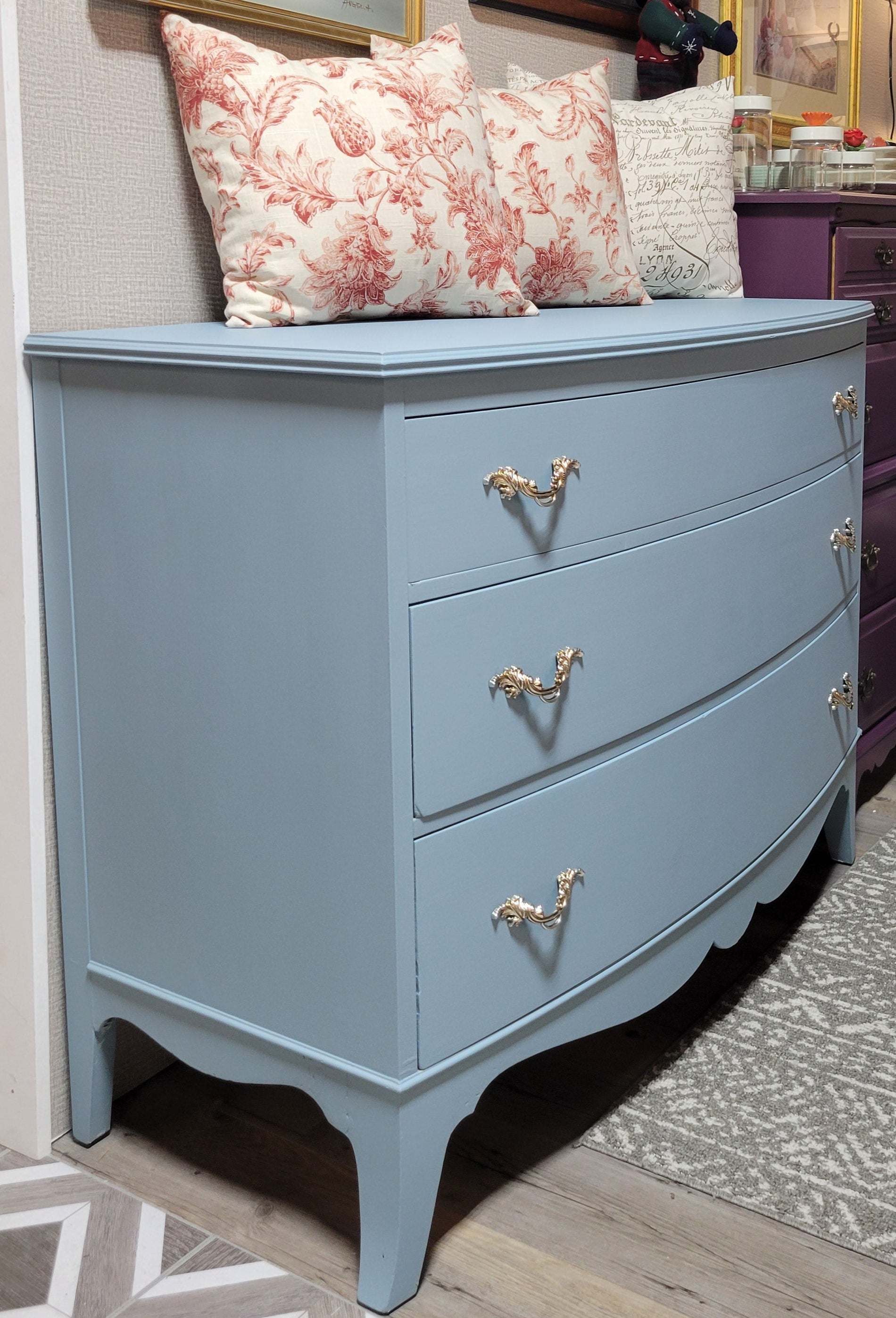 This stunning piece was in need of a redo. Now with fresh paint in a dreamy blue and gorgeous champage drawer pulls.