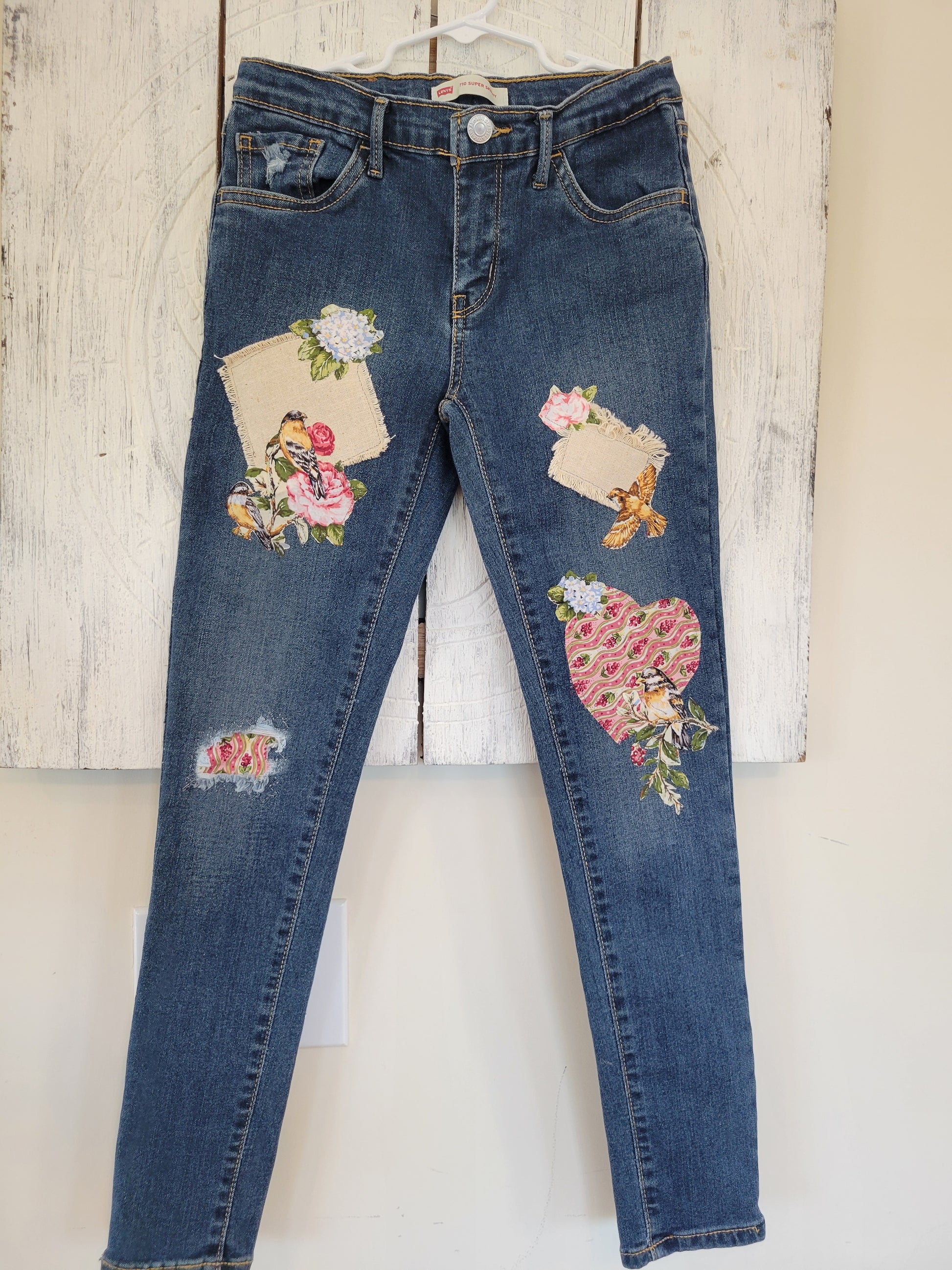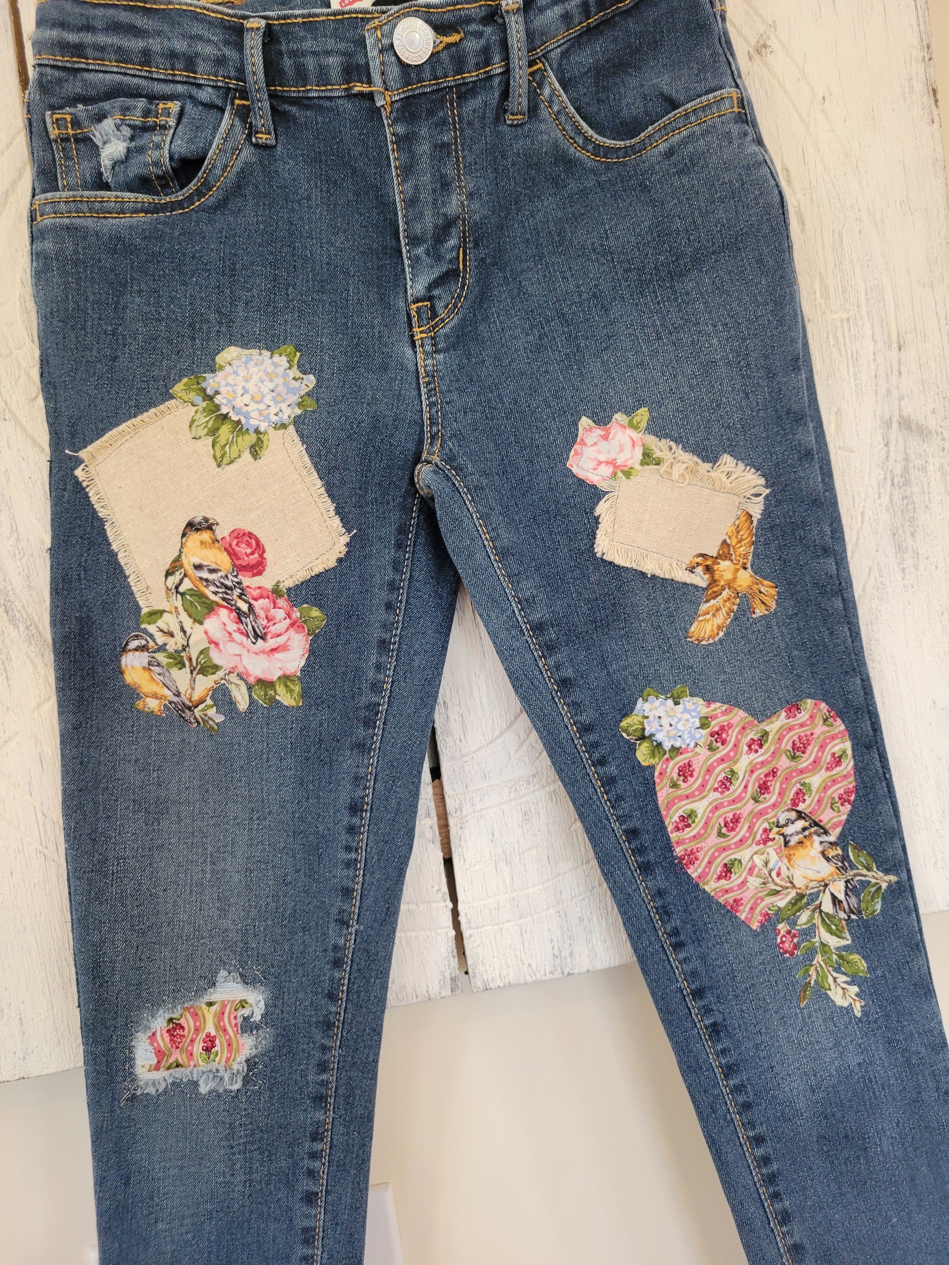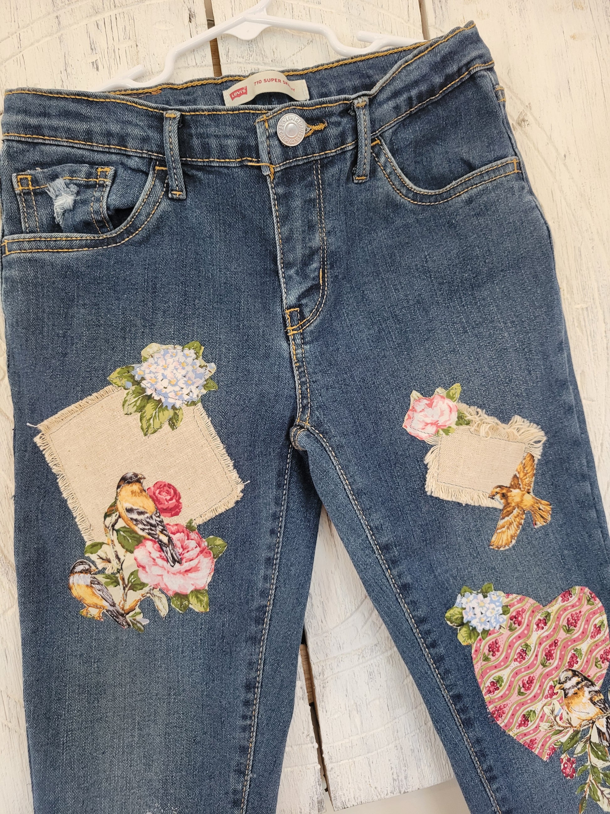 Upcycled Denin Jeans with Hearts, Flowers & Birds