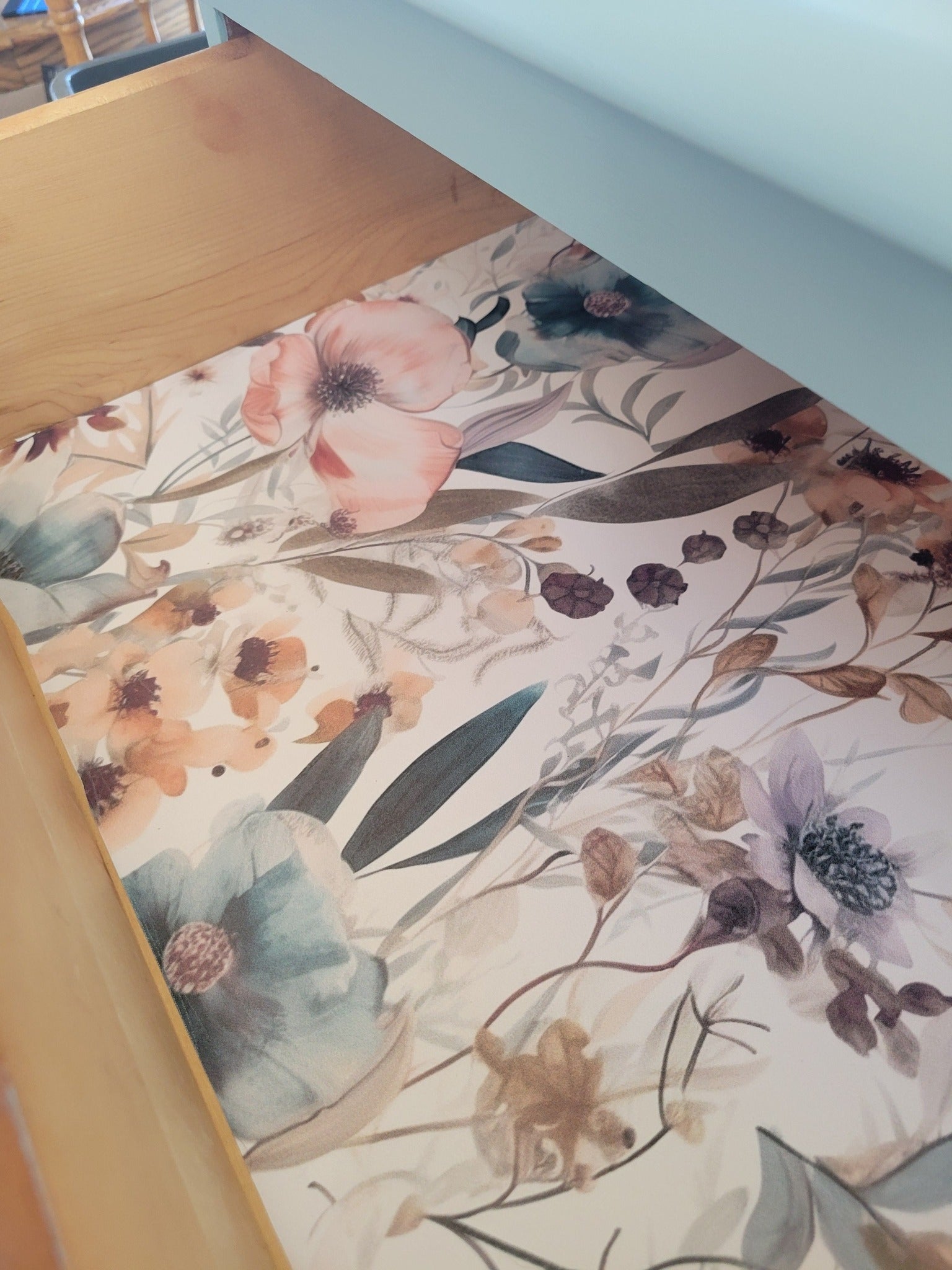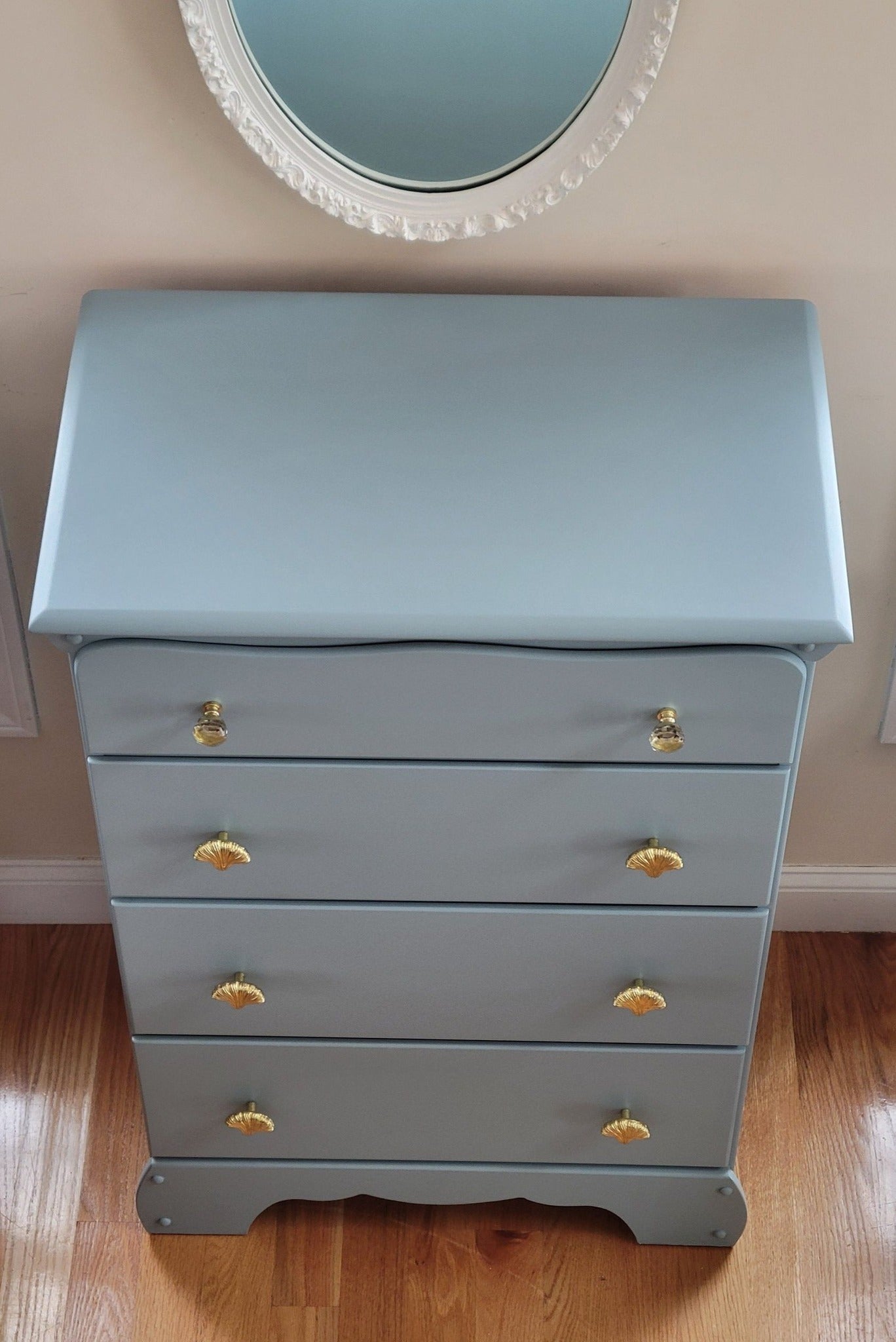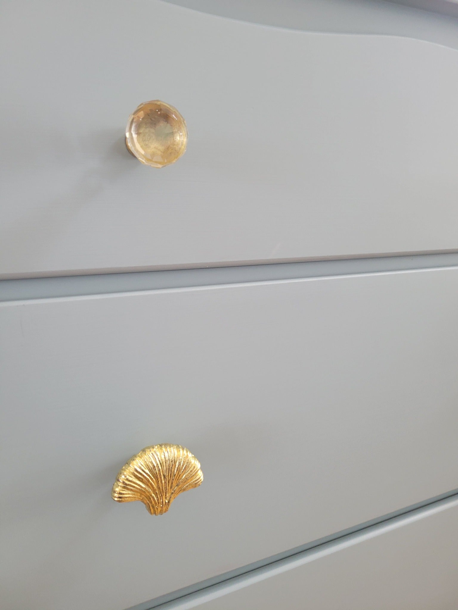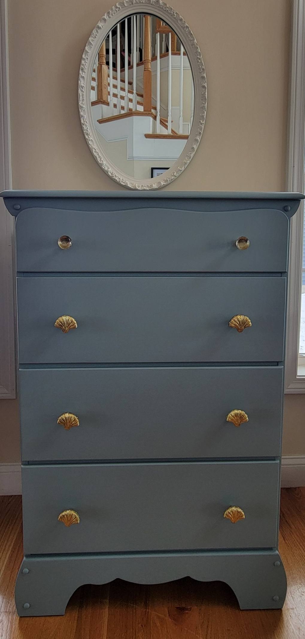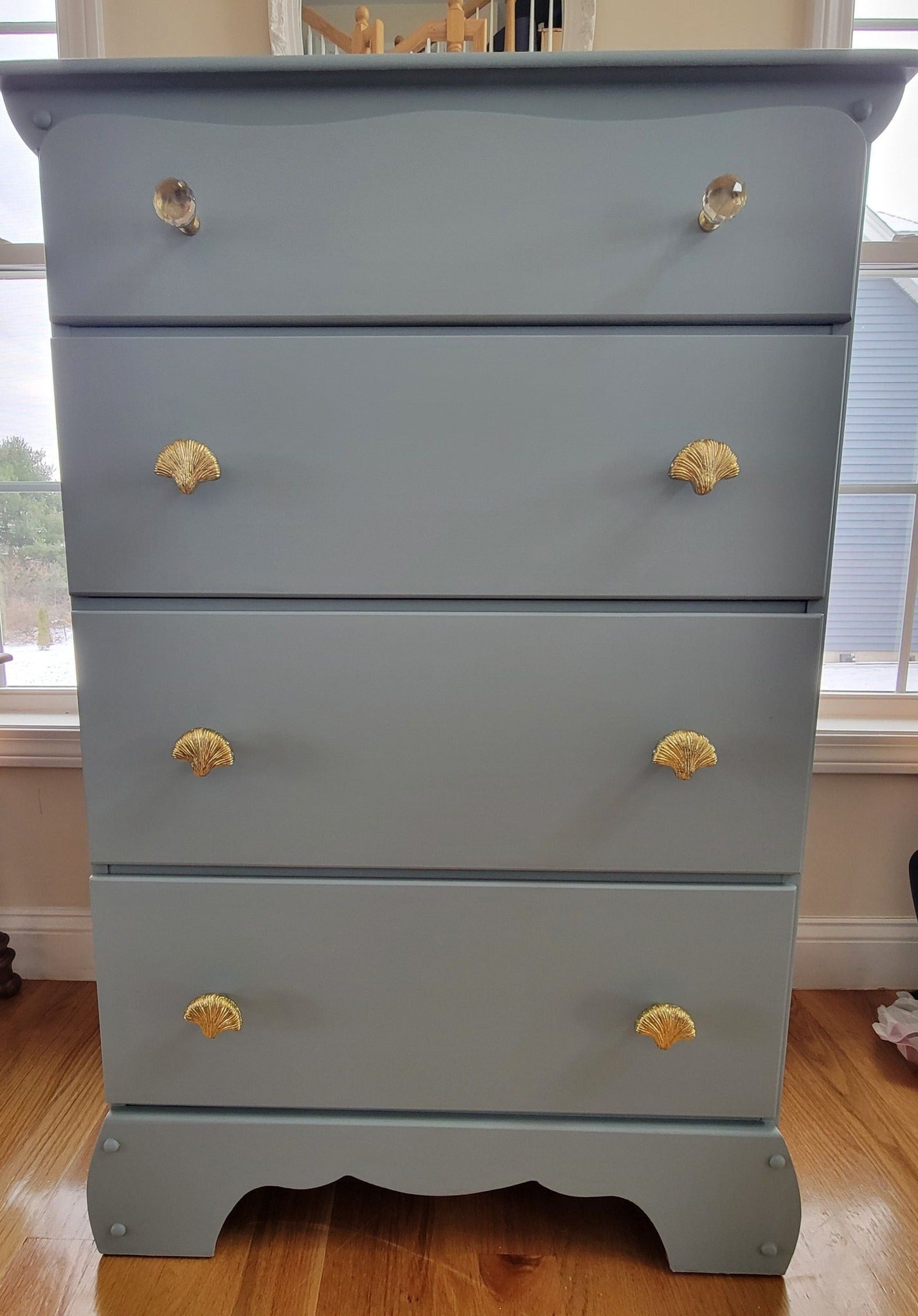 This maple dresser is solid and sturdy. 4 lined drawers. Gold pulls on the top drawer and coordinating gold shell knobs on the rest.
